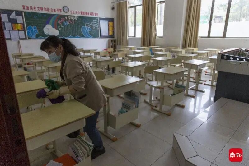老师对课室和宿舍进行消毒。 南都记者 梁炜培 摄