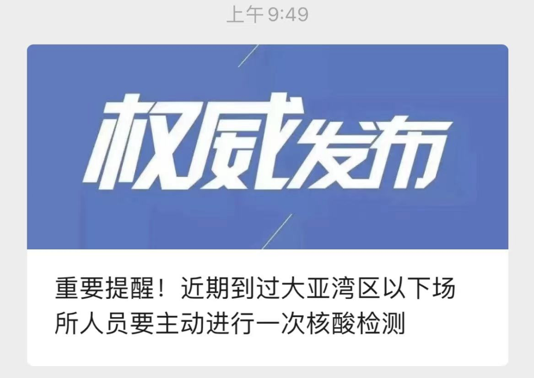 为了做好大亚湾区疫情防控工作,请各位市民按照要求做好配合,以便我区能做到及时发现、精准管控,防患于未然。大家无须恐慌,不信谣、不传谣。