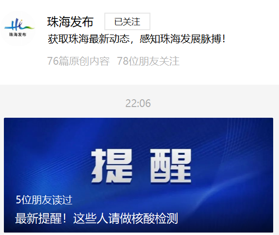 昨晚(10月6日),广东“珠海发布”发布消息称,市卫生健康部门提醒,市民从省外旅游、出差返回珠海后,建议主动做一次核酸检测,并自我观察14天,做好健康监测。