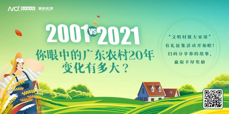2001-2021,20年来广东省各地农村发展建设取得了哪些翻天覆地的新变化?广大人民群众对“下一个五年”的乡村发展有哪些期待?即日起至2021年10月9日,广东省文明办联手南方都市报发起“文明村镇大家谈”有礼征集活动,以“2001 VS 2021,广东农村20年对比有多大?”为话题,征集广大群众对乡村20年发展变化的所见所感,直观地传递广东乡村振兴的发展成果。参与本次活动者均可领取参与奖一份;投稿如被录用,还可再获得价值500远的礼品奖励。点击 链接 或下图参与。