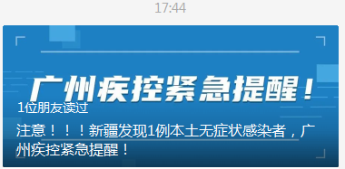 10月15日,新疆维吾尔自治区乌鲁木齐经济技术开发区(头屯河区)在每日一次核酸检测中发现1例本土无症状感染者,为货场工作人员。广州市疾控中心向市民发布紧急提醒: