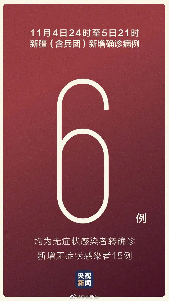 据通报,11月4日24时至5日21时,新疆报告新增新冠肺炎确诊病例6例,均为喀什地区无症状感染者转确诊病例,新增无症状感染者15例,均为喀什、克州对隔离医学观察人员进行核酸检测时筛查检出。