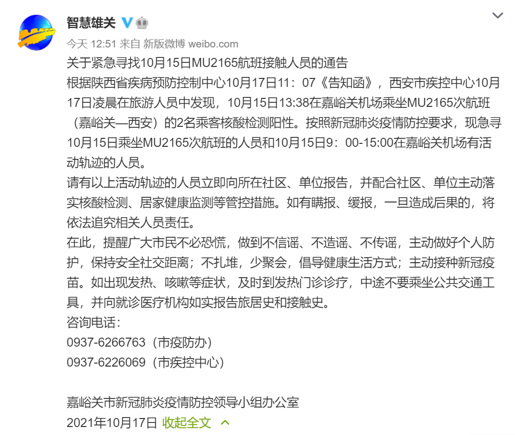 根据陕西省疾病预防控制中心10月17日11:07《告知函》,西安市疾控中心10月17日凌晨在旅游人员中发现,10月15日13:38在嘉峪关机场乘坐MU2165次航班(嘉峪关—西安)的2名乘客核酸检测阳性。按照新冠肺炎疫情防控要求,现急寻10月15日乘坐MU2165次航班的人员和10月15日9:00-15:00在嘉峪关机场有活动轨迹的人员。