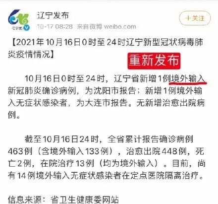 原来,今早辽宁省卫健委通报了昨日新冠疫情情况,其中沈阳报告的1例新增新冠肺炎确诊病例,未注明“境外输入”,导致不少网友担心。
