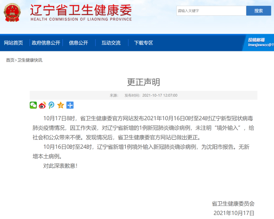 10月17日8时,省卫生健康委官方网站发布2021年10月16日0时至24时辽宁新型冠状病毒肺炎疫情情况,因工作失误,对辽宁省新增的1例新冠肺炎确诊病例,未注明“境外输入”,给社会和公众带来不便。发现情况后,省卫生健康委官方网站已做出更正。
