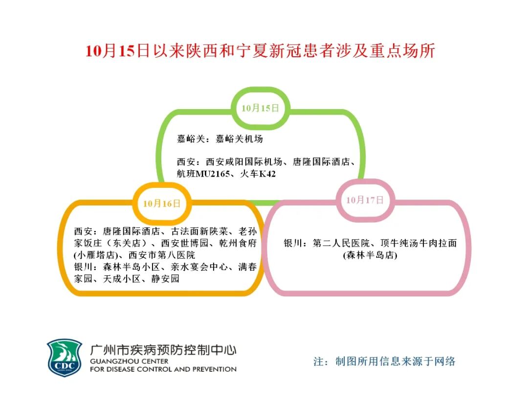 10月17日0时至18日7时,陕西西安通报外省游客6例本土确诊病例和1例本土无症状感染者,宁夏银川通报1例外省返银确诊病例,8人系共同出游人员,病例涉及重点场所如图所示: