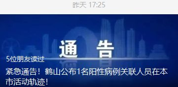 2021年10月18日,我市接报刘某某是陕西省通报的两例核酸检测阳性病例的关联人员,该人员近日有在鹤山辖区活动的轨迹。