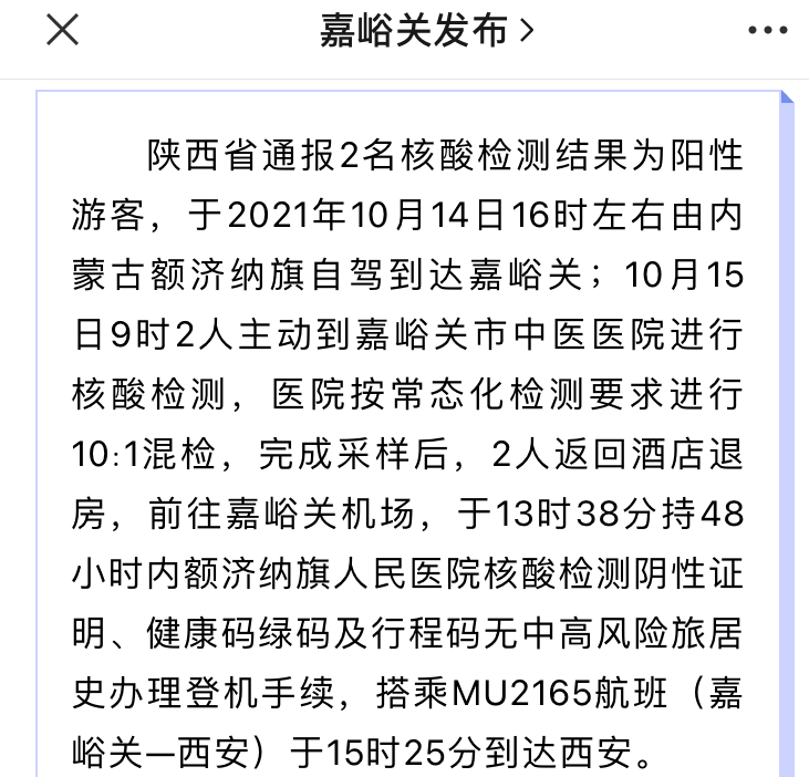 “10月13日傍晚,我们在内蒙古额济纳旗做了核酸检测,结果为阴性”,姜先生告诉记者,第二天他们自驾前往甘肃省嘉峪关市。计划游览后于10月15日飞往西安。此前他们了解到,进入西安,需要出示48小时以内新冠病毒核酸检测阴性报告,飞机将于15时左右到达西安,他们在额济纳旗的检测报告时间有效。