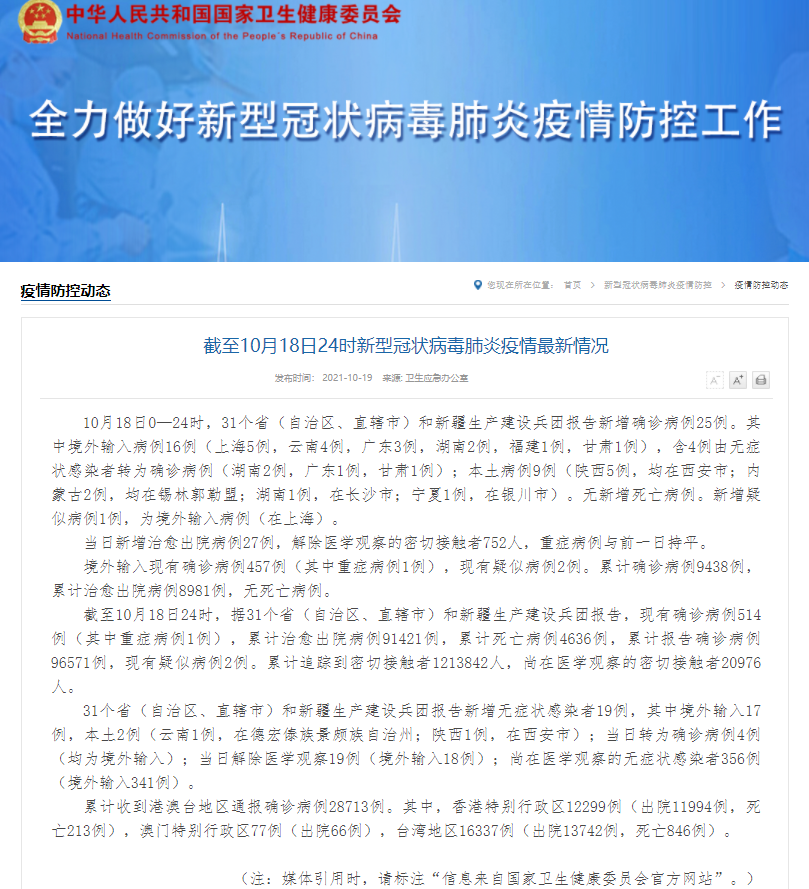10月18日0—24时,31个省(自治区、直辖市)和新疆生产建设兵团报告新增确诊病例25例。其中,本土病例9例(陕西5例,均在西安市;内蒙古2例,均在锡林郭勒盟;湖南1例,在长沙市;宁夏1例,在银川市)。无新增死亡病例。新增疑似病例1例,为境外输入病例(在上海)。