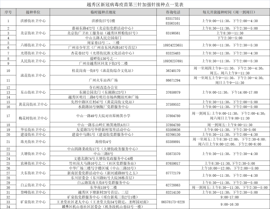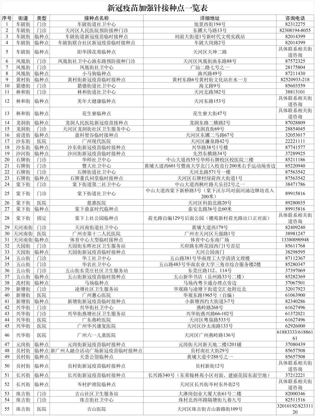 此外,天河区接种新冠疫苗加强针工作采取“三不限制”。符合接种条件人群,不分户籍居住地,均可在天河接种。全区所有新冠疫苗接种点均可接种各类人群。