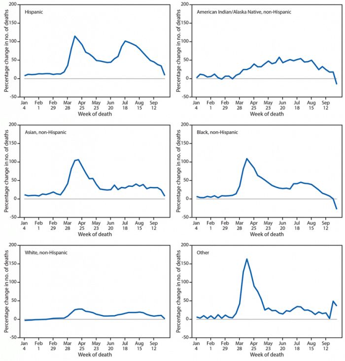 CDC报告中的年龄和种族趋势也揭示了这种流行病如何不成比例地打击某些人口群体。显示每周死亡人数相对于往年同期平均人数的图表显示,与白人死亡率相比,西班牙裔、黑人和亚裔社区的超额死亡人数更高。