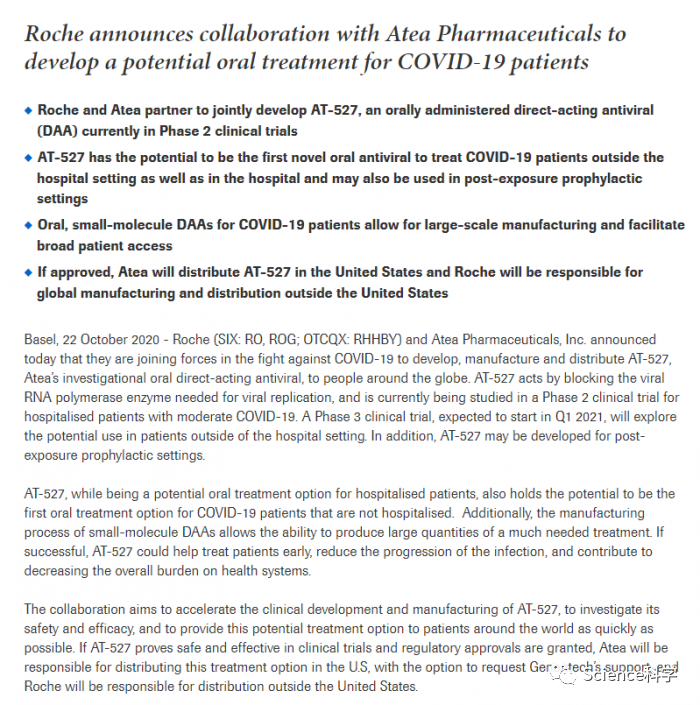 罗氏宣布与Atea合作开发针对COVID-19患者的新型口服抗病毒药物