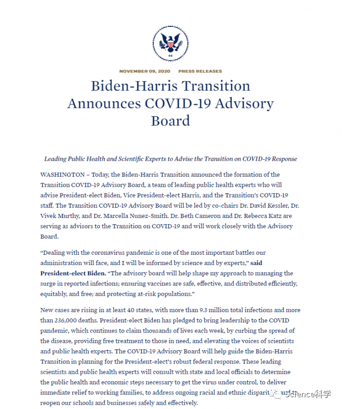 拜登过渡团队宣布成立新冠顾问委员会:由13名公共卫生专家组成,希望在全美范围内实施强制口罩令