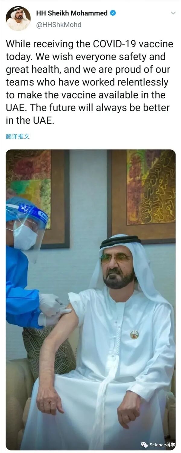 11月3日,阿拉伯联合酋长国副总统兼总理、迪拜酋长阿勒马克图姆分享了自己正在接种国药集团中国生物新冠疫苗的照片,并表示:“在我接种疫苗时我希望所有人安全、健康。我们非常感谢我们的团队,正是他们没日没夜地工作使得阿联酋得以接种新冠疫苗。阿联酋的未来更美好。”