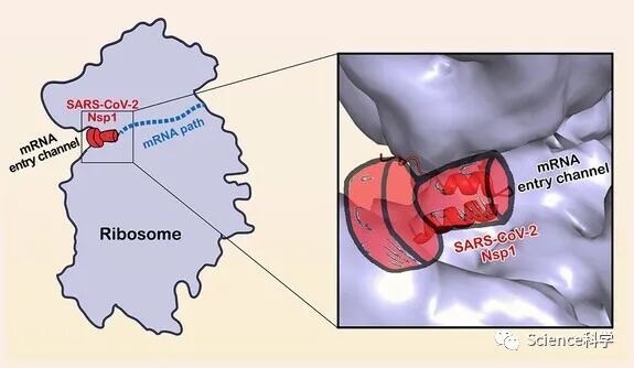 图/SARS-CoV-2蛋白Nsp1堵塞了核糖体上的信使RNA(mRNA,即基因蓝图)进入通道,阻止宿主蛋白质的产生。