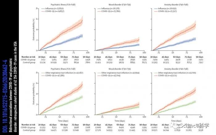 在与包括流感、其它呼吸道感染、皮肤感染、胆结石、尿结石、大骨骨折等六类健康事件进行比较之后,研究表明 COVID-19 发展出精神障碍的可能性是流感患者的 1.8 ~ 2.5 倍。