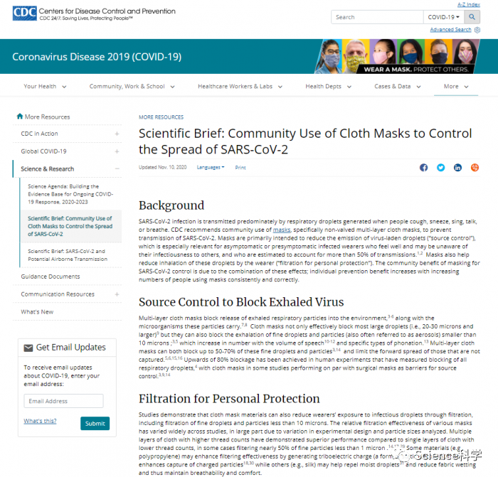 新指南引用了几项研究来支持“布制口罩材料还可以通过过滤,包括过滤细小的飞沫和小于10微米的颗粒,减少佩戴者对感染性飞沫的暴露 ”这一结论。CDC提到了最近的一次高暴露事件,两名受感染的发型师在戴上口罩的同时,与139名同样戴着口罩的客户进行了平均15分钟的互动。在同意接受采访的67名客户中,没有一人被感染。对该事件的传闻报道表明,其他72名顾客也没有被感染。