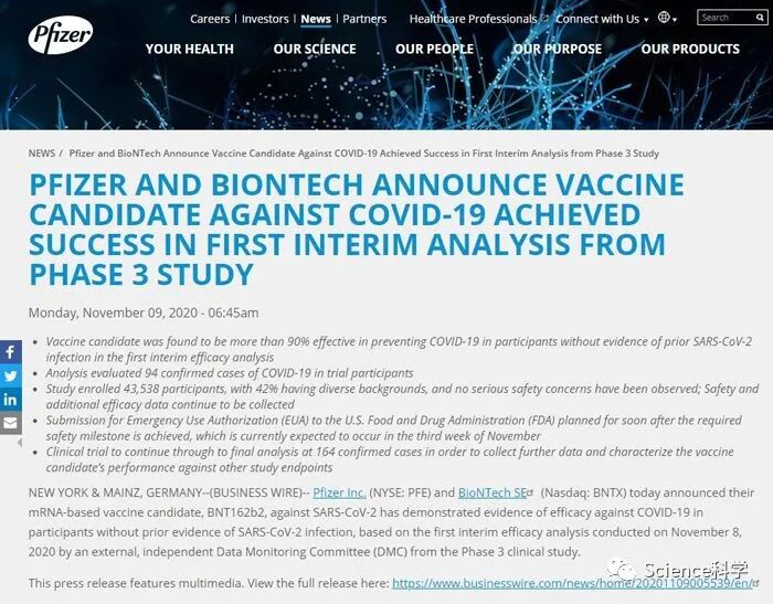 11月9日,知名药企辉瑞(Pfizer)宣布最新研制的疫苗对新冠病原体的有效性超过 90%。事实上,辉瑞并没有制造出这种疫苗,而是一家名为 BioNTec 的德国公司开发了 mRNA 疫苗。根据现有的临时数据显示,BioNTech 药物显示出了令人难以置信的功效,BioNTech 首席执行官 Uğur Şahin 认为该药物具有结束新冠疫情的潜力。