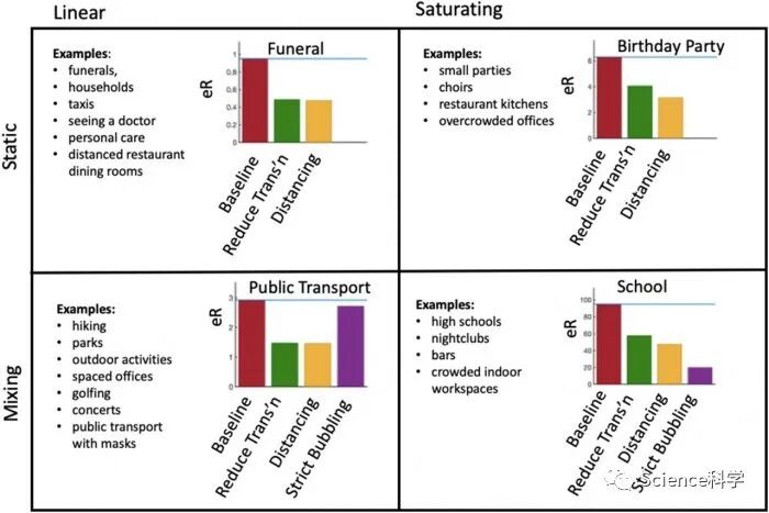 研究人员“指出,口罩和其他物理屏障在饱和的高传播环境(派对、合唱团、餐厅厨房、拥挤的办公室、夜总会和酒吧)中可能不那么有效,因为即使口罩将传播率减半,也可能对传播概率(因此对感染数量)没有太大影响。”