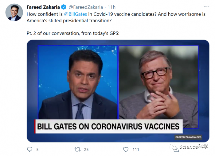 但这三种疫苗的实际进展让盖茨相信更多的药物将会有效。盖茨告诉CNN的Fareed Zakaria:“几乎所有的疫苗都有效,而且效果非常好。我乐观地认为,等到明年2月,它们很有可能被证明是非常有效和安全的。”