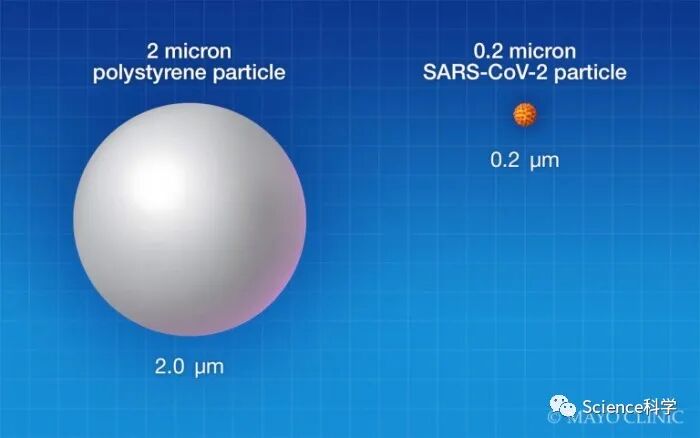 美国疾控中心和世卫组织都认为病毒主要通过飞沫传播,两个机构都承认气溶胶传播有风险。研究人员发布了以下图片,将SARS-CoV-2病毒的大小与2微米的颗粒进行了对比,意在代表可能含有新冠病毒的气溶胶颗粒的大小。