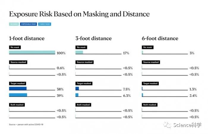 该研究还测量了气溶胶粒子从源头到目标的不同距离。研究人员发现,粒子数量随着距离的增加而减少,支持美国疾控中心关于保持社交距离的指导意见,建议人与人之间的距离为6英尺。下图显示了基于口罩和社交距离的暴露风险。研究人员发现,即使两个受试者距离超过六英尺,口罩也会有所帮助。