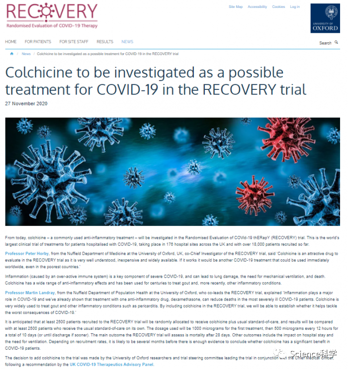 “炎症在COVID-19中起着重要的作用,我们已经证明,使用一种抗炎药--地塞米松进行治疗,可以减少病情最严重的COVID-19患者的死亡,”Martin Landray教授在一份声明中说。“秋水仙碱非常广泛地用于治疗痛风和其他炎症,如心包炎。通过将秋水仙碱纳入RECOVERY试验,我们将能够确定它是否有助于解决COVID-19的最严重后果。”