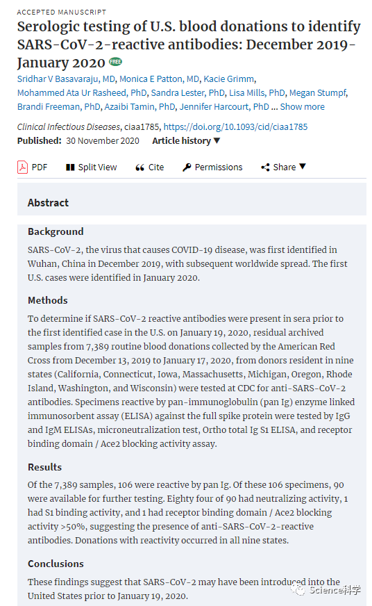 CDC周一公布的一项新政府研究显示,一些在2019年12月中旬献血的美国人已经有这种新冠的循环抗体。抗体通常在感染后几周就可以检测到,因此研究结果表明,美国公民在去年12月的前几周的某个时间点上已经从COVID-19中恢复过来。