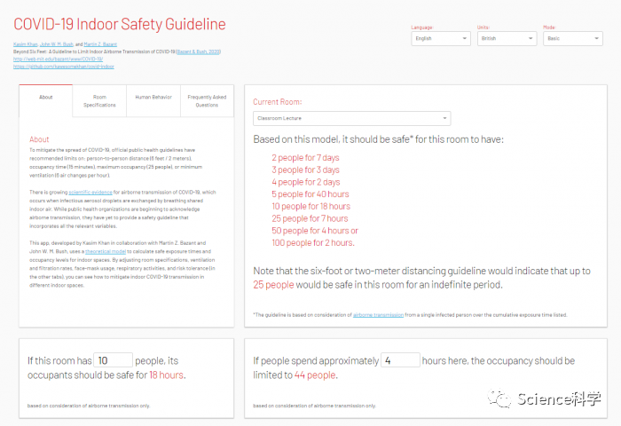 来自麻省理工学院的研究人员利用研究成果创建了一个网站,揭示了当与新冠患者待在一个房间里时,需要多长时间会感染新冠病毒。传播的风险取决于几个变量(房间大小、戴口罩),网站上的用户可以根据自己的环境进行调整。