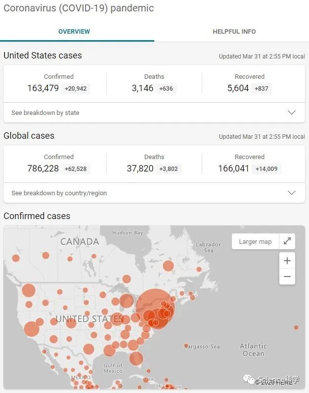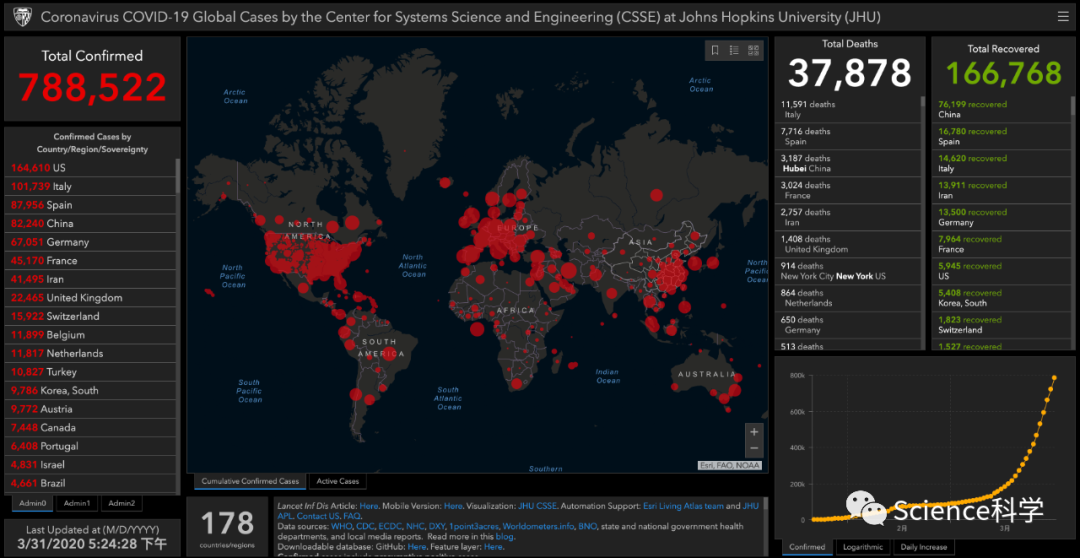 美国约翰斯·霍普金斯大学实时统计数据:2020年3月31日18时16分全球疫情实况跟踪展示板该可视化展示板由(Johns Hopkins)约翰·霍普金斯大学系统科学与工程中心的团队建立,主要用于描述2019-nCov冠状病毒在中国及全球其他地区的传播情况,并会根据来自WHO、CDC等来源的数据定期更新。访问链接:https://arcg.is/0fHmTX