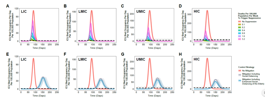 各种控制策略在代表性环境中的影响。使用年龄结构化的SEIR模型以及代表低收入国家(LIC),中等低收入国家(LMIC) ,中等高收入国家(UMIC)和高收入国家(HIC)(从左至右的列)的人口统计和社交疏离方式。所有数字均显示每10万人每天的ICU床位占用量。首行图显示压制的影响(有时取决于每周的死亡率增加超过某些确定的阈值而触发),下一行显示减缓措施(涉及涉及整个人群的总体社会隔离的缓解措施或涉及整个人群的缓解措施。以及老年人的社交距离增加),Patrick GT Walker, Charles Whittaker, Oliver Watson et al. The Global Impact of COVID-19 and Strategies for Mitigation and Suppression,P10