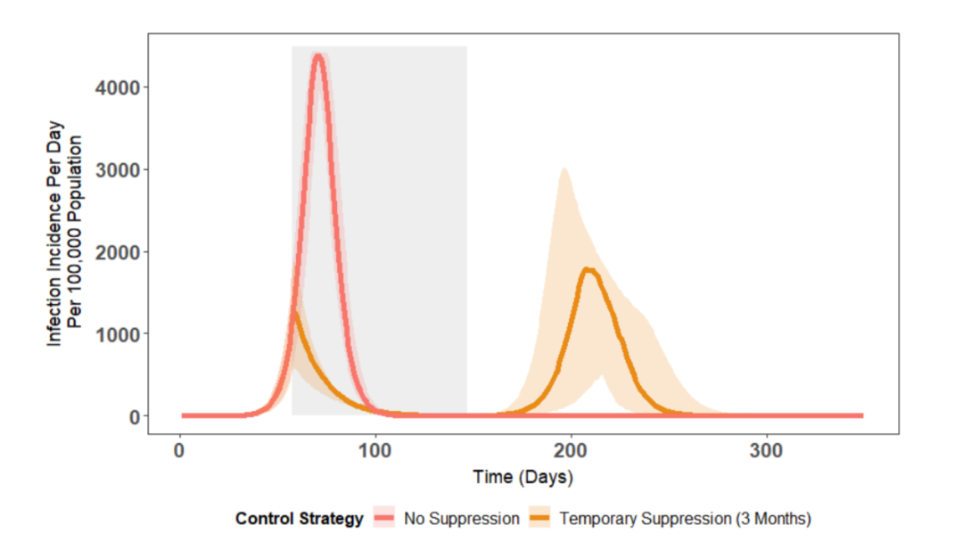 在代表性的较低收入环境中,临时压制对感染发生率的影响。在此示例中,压制政策维持了3个月,但随后放松压制,并假设接触方式恢复到先前的水平的传播情况。