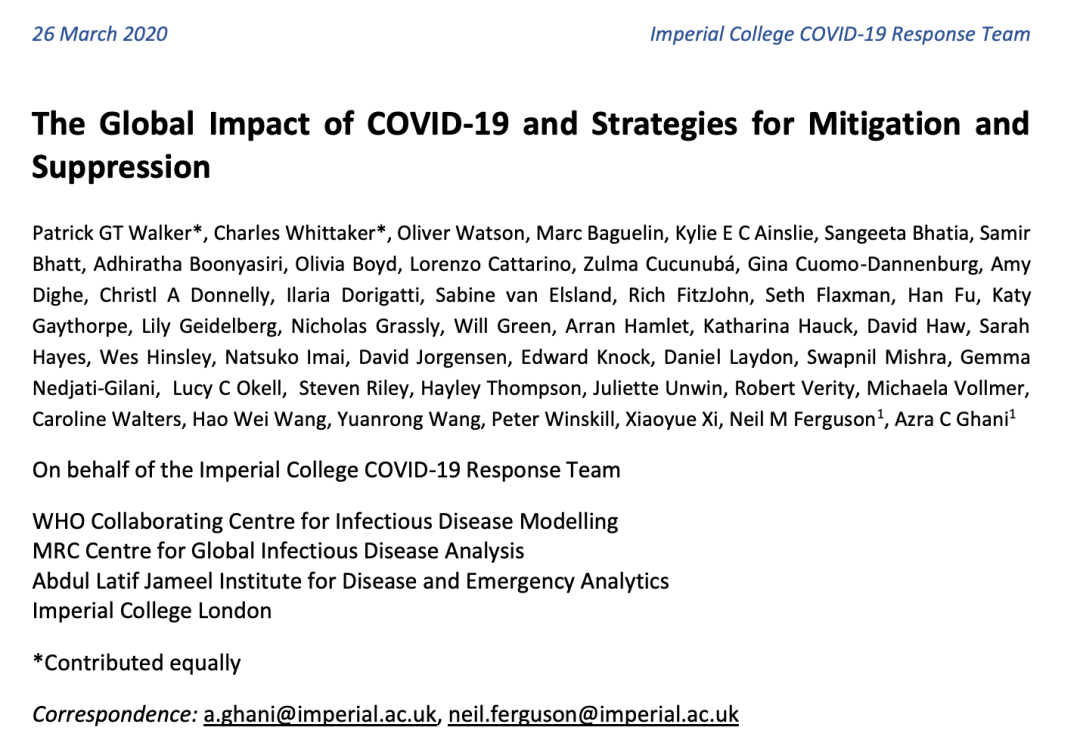 Patrick GT Walker, Charles Whittaker, Oliver Watson et al. The Global Impact of COVID-19 and Strategies for Mitigation and Suppression. WHO Collaborating Centre for Infectious Disease Modelling, MRC Centre for Global Infectious Disease Analysis, Abdul Latif Jameel Institute for Disease and Emergency Analytics, Imperial College London (2020)