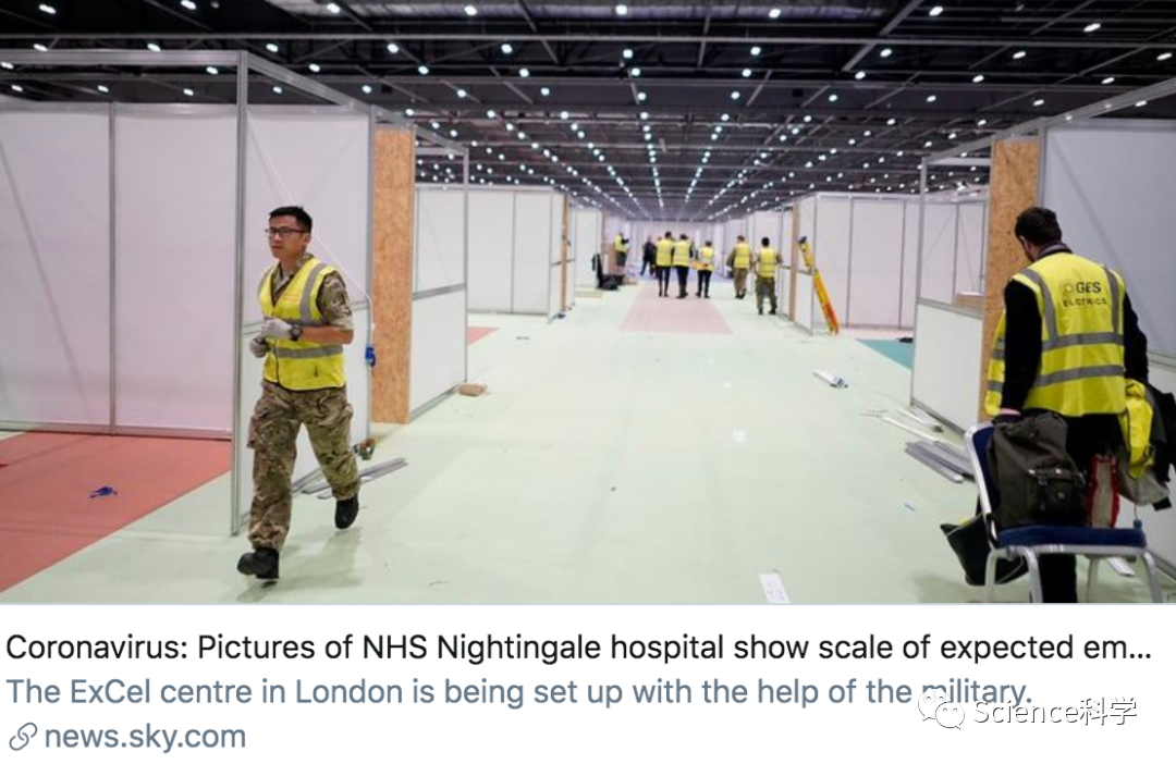 英国天空新闻网报道。推特截图位于伦敦的方舱医院,将由伦敦国际会展中心(ExCel)改造而成,最初将提供500张配备呼吸机和氧气设备的床位,饱和时可收治4000名患者。目前,这座方舱医院被命名为“南丁格尔医院”,由军方和NHS共同管理。南丁格尔医院最早预计可在本周内投入使用。