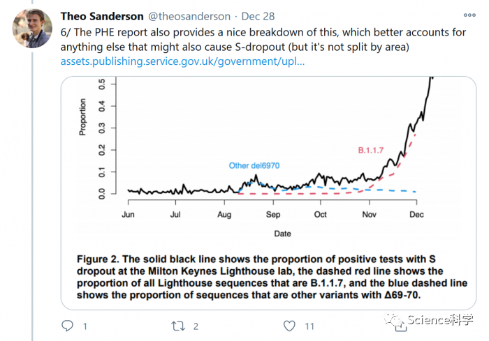 当然,这并不是一个完美的度量标准:S基因突变也出现在其他不具有B.1.1.7特征的变体中。不过英国的研究人员已经设法理清数据并计算出有多少缺失来自新变种。随着B.1.1.7变体感染率的增加,S基因缺失的发生率也与之密切相关。