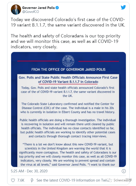 根据州长Jared Polis在Twitter上分享的公告,目前在Elbert县被隔离的一名20多岁的男子感染了新冠病毒B.1.1.7菌株。