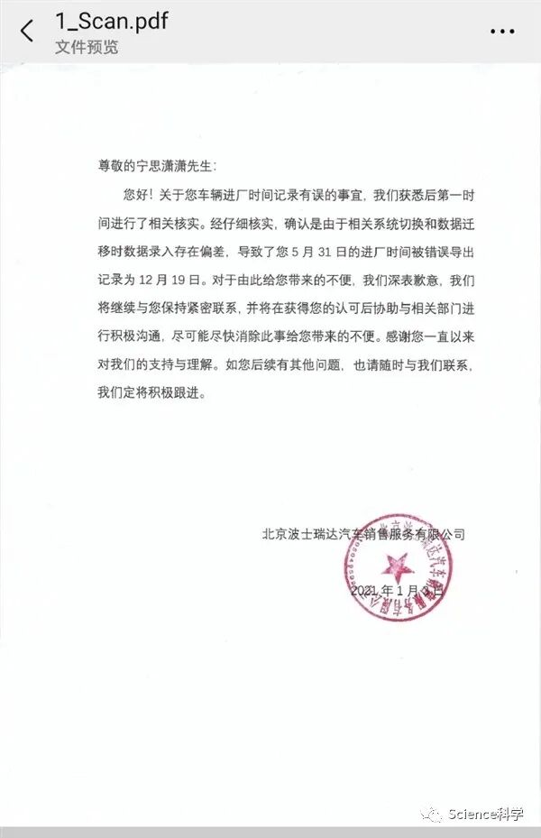 经调查后得知,原来是该4S店“系统升级造成的误操作”。对此,该4S店表示,由于相关系统气如虹和数据迁移数据录入存在偏差,导致博主于5月31日进厂时间被错误导出记录为12月19日,对此表示歉意,并加盖了公章。