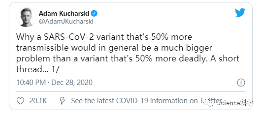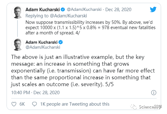 《大西洋月刊》杂志上的一篇文章标题这样写道,“变异病毒是一颗定时炸弹”,解释了为什么英国的变异毒株如此危险。文章引用了伦敦卫生与热带医学院教授 Adam Kucharski在Twitter上提出的一个简单例子。