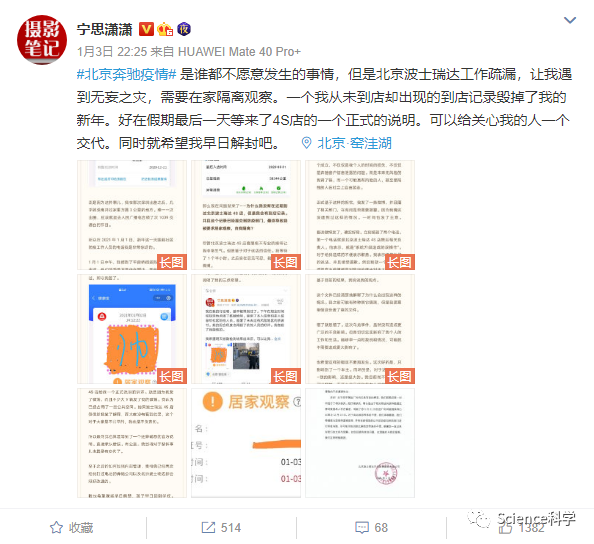 据新浪博主@宁思潇潇爆料,自己1月1日收到了防疫站打来的电话,告知其近期去过北京波士瑞奔驰4S店,需要配合防疫工作。一是居家隔离,二是在规定时间地点做核酸检测。