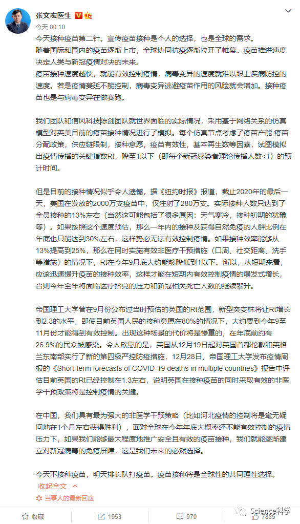张文宏还表示,在中国,我们具有最为强大的非医学干预策略(比如河北疫情的控制将是毫无疑问地在1个月左右获得胜利),面对全球在今年年底大概率还不能有效控制的疫情压力下,如果我们能够最大程度地推广安全且有效的疫苗接种,我们就能逐渐建立对新冠病毒的免疫屏障,这是我们未来的必然选择。