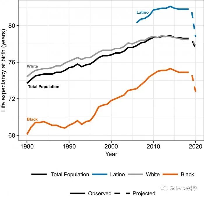 从2020年开始,少数族裔社区的预期寿命下降更加令人不安。据预测,黑人社区的预期寿命将下降2.10岁(降至72.78岁),拉丁裔的预期寿命将下降3.05岁(降至78.77岁)。