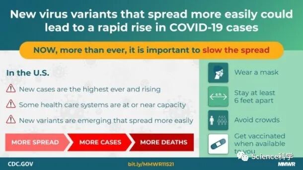 CDC表示:“早期的努力可以限制B.1.1.7变种的传播,如普及和提高对公共卫生缓解战略的遵守,将使持续的疫苗接种有更多的时间来实现更高的人口水平免疫力。”