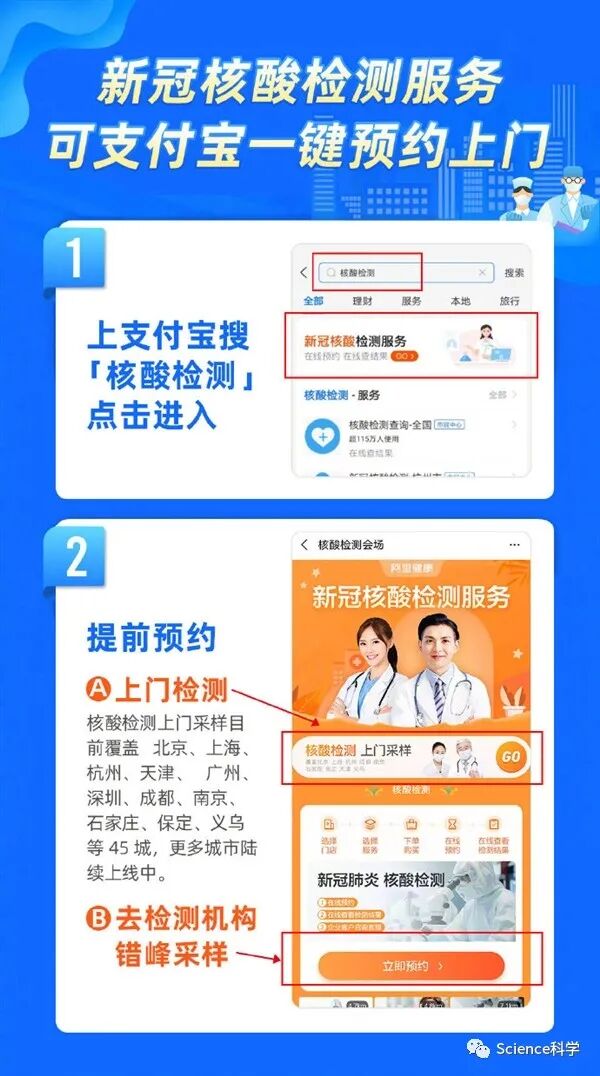 据悉,用户通过支付宝搜“核酸检测”,点击进入“新冠核酸检测服务”专区,即可查询全国采样点位置或附近核酸检测机构位置,可进行提前预约检测,或预约上门采样。