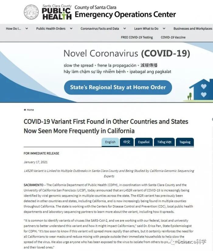加州公共卫生局(CDPH)与圣克拉拉县和加州大学旧金山分校(UCSF)共同宣布,通过基因检测发现的L452R菌株越来越多。这种新的变异毒株不同于B.1.1.7。这种新毒株最早出现在其他国家和美国其他州,要追溯到去年3月份,当时它首次出现在丹麦。根据Deadline的报道,它在2020年5月初出现在加州。但自11月以来,L452R的出现频率更高。