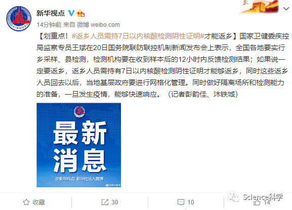 国家卫健委:返乡人员需持7日以内核酸检测阴性证明