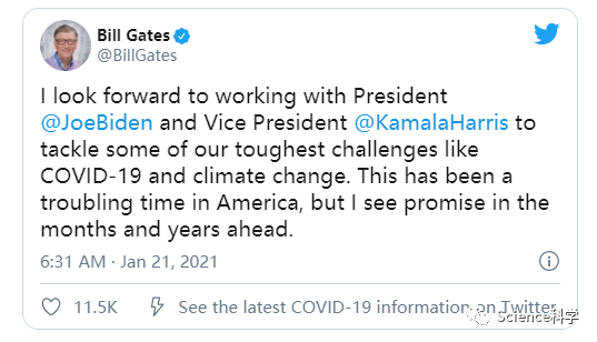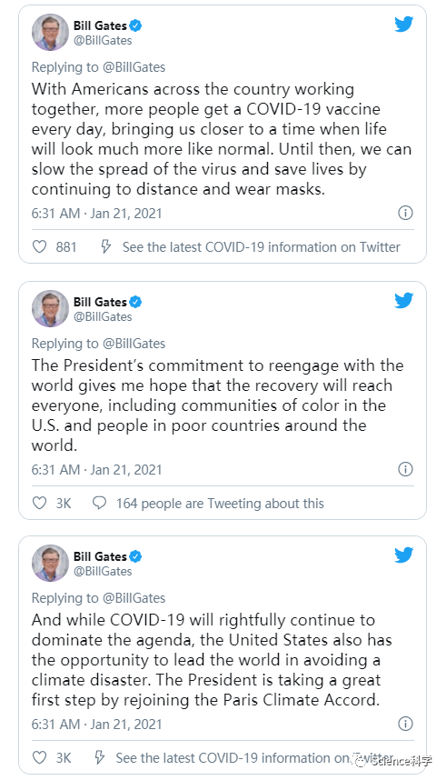 在另外三条推文中,盖茨鼓励美国民众应继续保持社交距离,戴上口罩并接种COVID-19疫苗,并指出这最终将使美国民众回归更正常的生活。他还称赞拜登 “致力于重新与世界接触”,以及决定重新加入《巴黎气候协定》。事实上,拜登确实在当地时间周三下午签署了重新承诺美国这样做的文件。