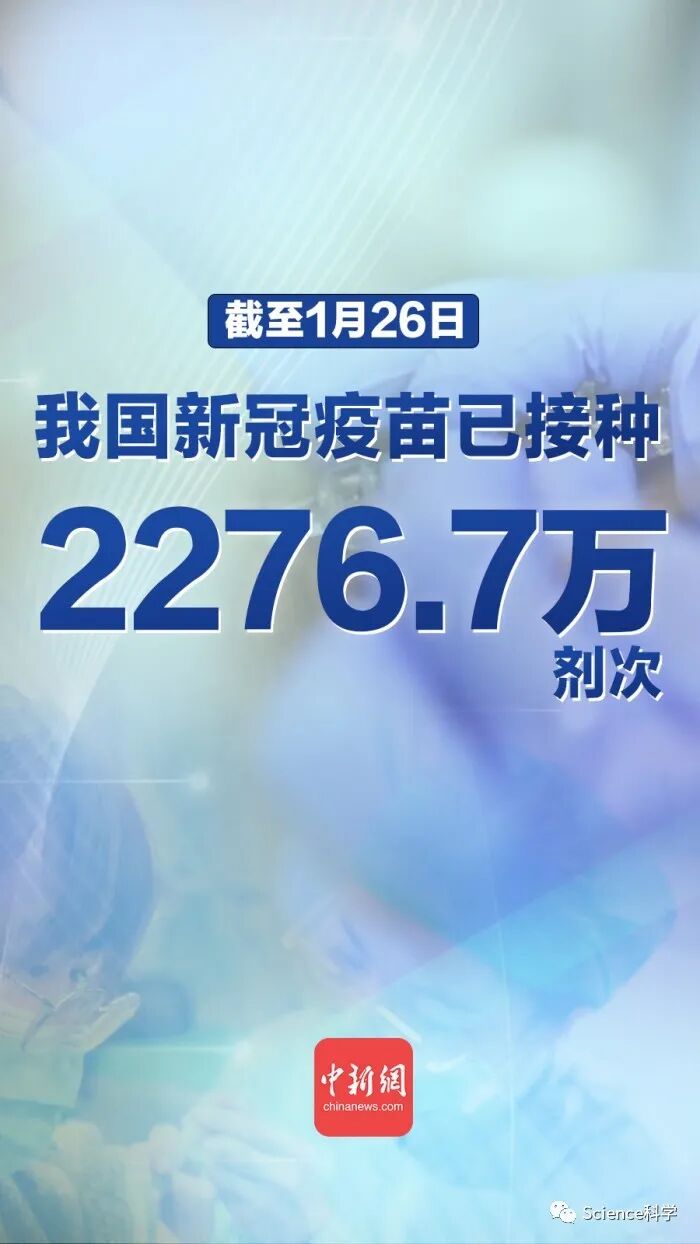 今天的国务院联防联控机制举行新闻发布会上,国家卫生健康委副主任曾益新透露,总体来讲,我国的新冠疫苗接种工作平稳有序,截至1月26日已接种2276.7万剂次。他进一步表示,我国已同步实现新冠疫苗的信息化管理,每一支疫苗都能做到全程可追溯。
