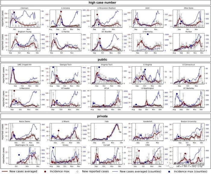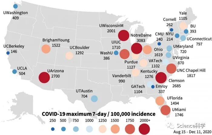 有趣的是,大多数院校能够迅速控制疫情,抑制校园范围内的感染,而周边社区在控制病毒传播方面却不太成功。因此,对于大多数院校来说,在整个2020年秋季,疫情动态仍处于可控状态,日均病例数在300例以下的窄幅高峰。