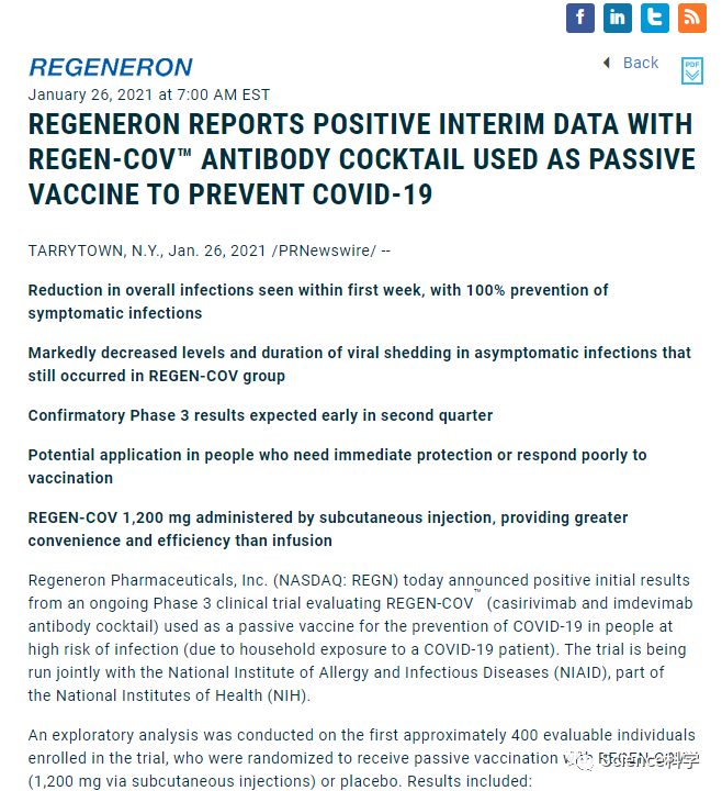 “在这项预防试验中,REGEN-COV是以注射而不是输液的方式给药,这让患者和负担过重的医疗机构和设施的管理更加方便和高效。”Regeneron全球临床开发主管David Weinreich说。