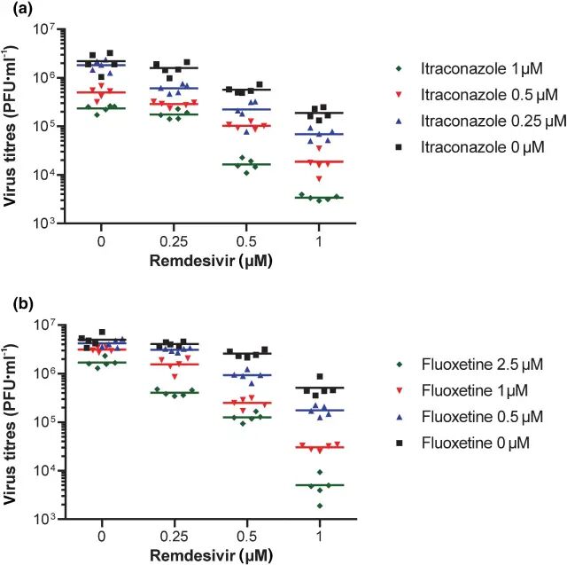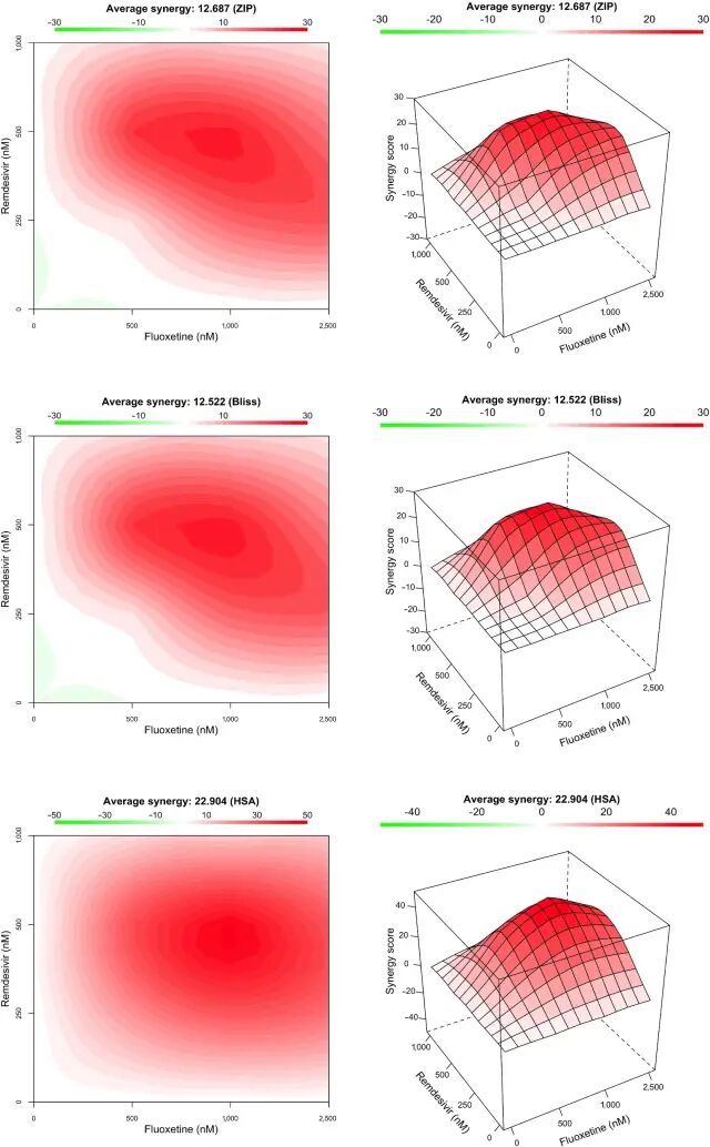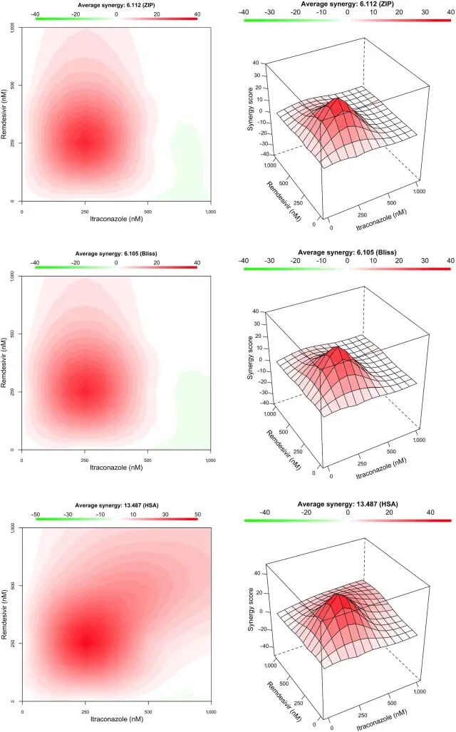 当任何一种药物与抗病毒药物雷米西韦联合使用时,该组合便会显示出协同作用,且对SARS-CoV-2的产生抑制率超过90%。